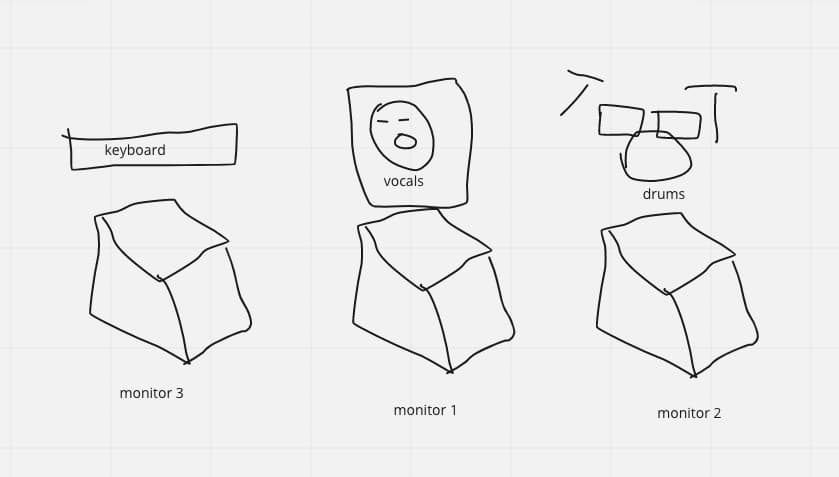 - Mix 2 manages Monitor 2 (in front of drums)
